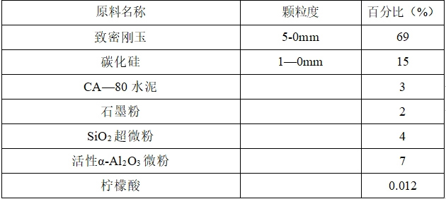 自20世紀70年代開始研制Al2O3—SiC—C質(zhì)澆注料,隨著不定形耐火材料技術(shù)進步,開發(fā)了粘土結(jié)合、鋁酸鈣水泥結(jié)合、硅溶膠結(jié)合、ρ-Al2O3結(jié)合、磷酸二氫鋁結(jié)合等Al2O3—SiC—C質(zhì)澆注料。加上施工及維修等的技術(shù)進步,又開發(fā)了免烘烤澆注料、快干型澆注料、自流型澆注料、環(huán)保型澆注料等。但始終都是屬于Al2O3—SiC—C質(zhì)澆注料。代表性的配料見表1。